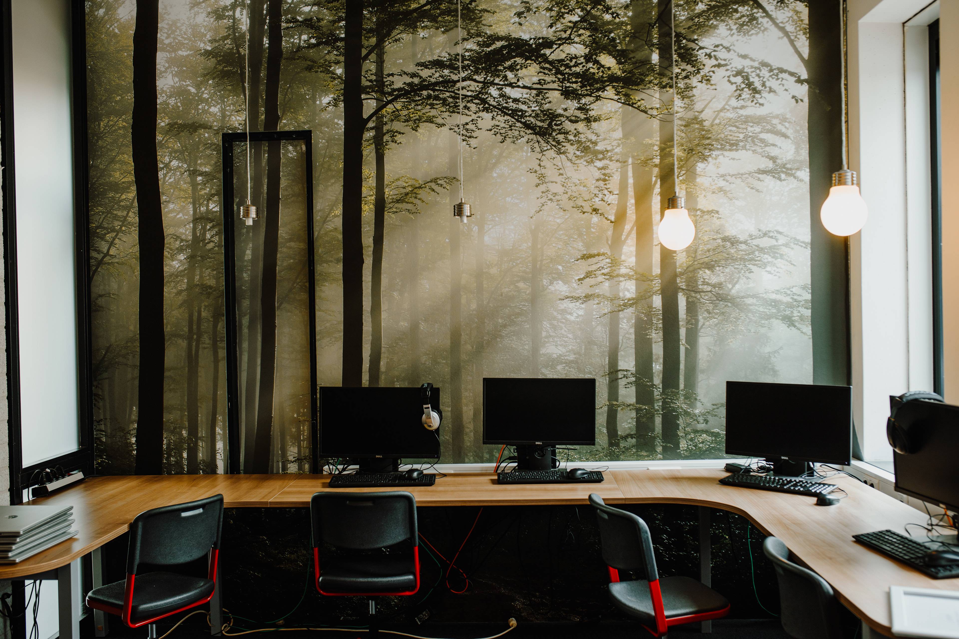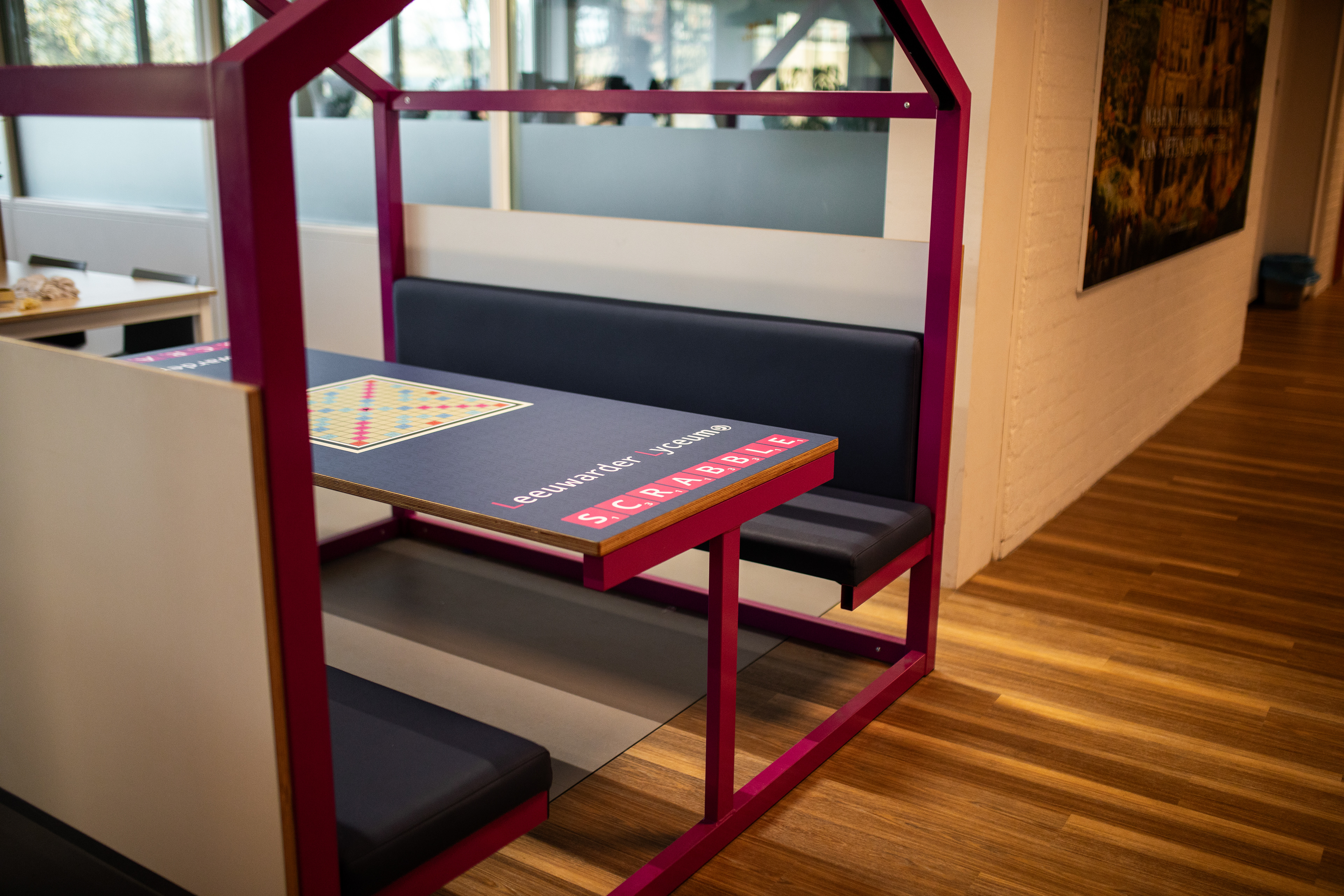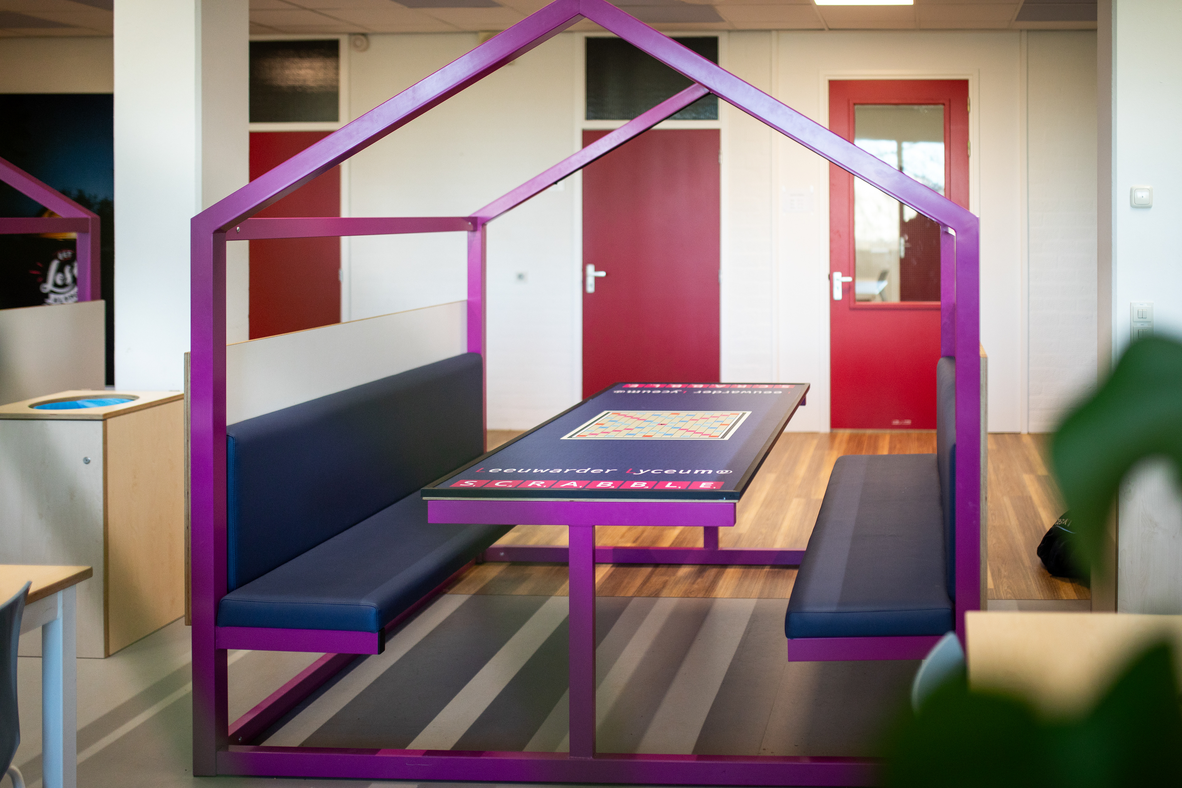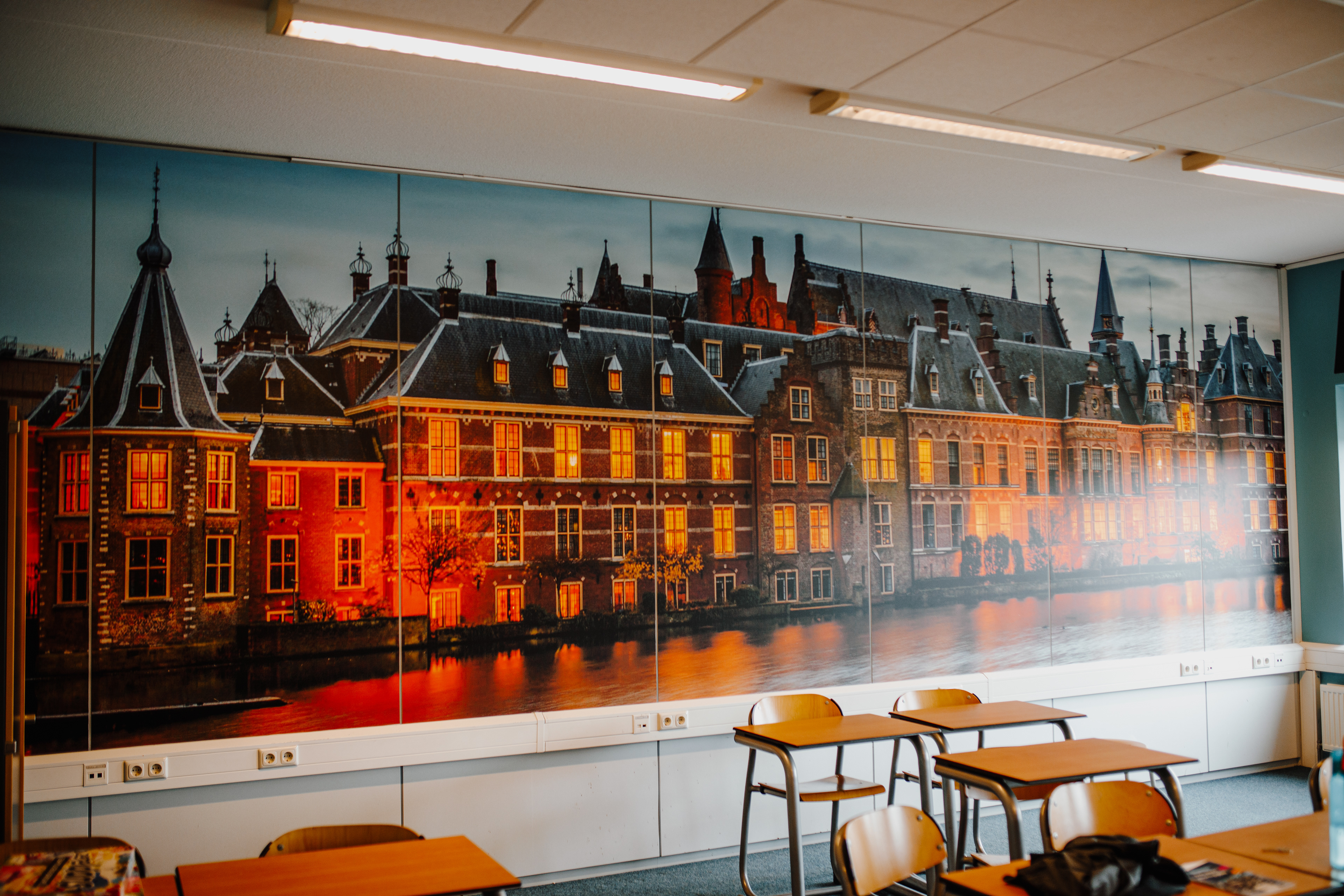 Ik merkte al snel dat de ruimtes weinig uitstraling hadden. Door het toevoegen van grote, passende beelden konden we die sfeer helemaal veranderen. Zo heb ik bijvoorbeeld achter de computers een rustig bosbeeld geplaatst om een kalme werkomgeving te creëren. In een ander lokaal heb ik een grote print van het Torentje van Rutte ontworpen, wat meteen karakter gaf aan de ruimte. Voor de kantinetafels ontwierp ik bordspellen, zodat leerlingen daar ook samen iets kunnen doen.