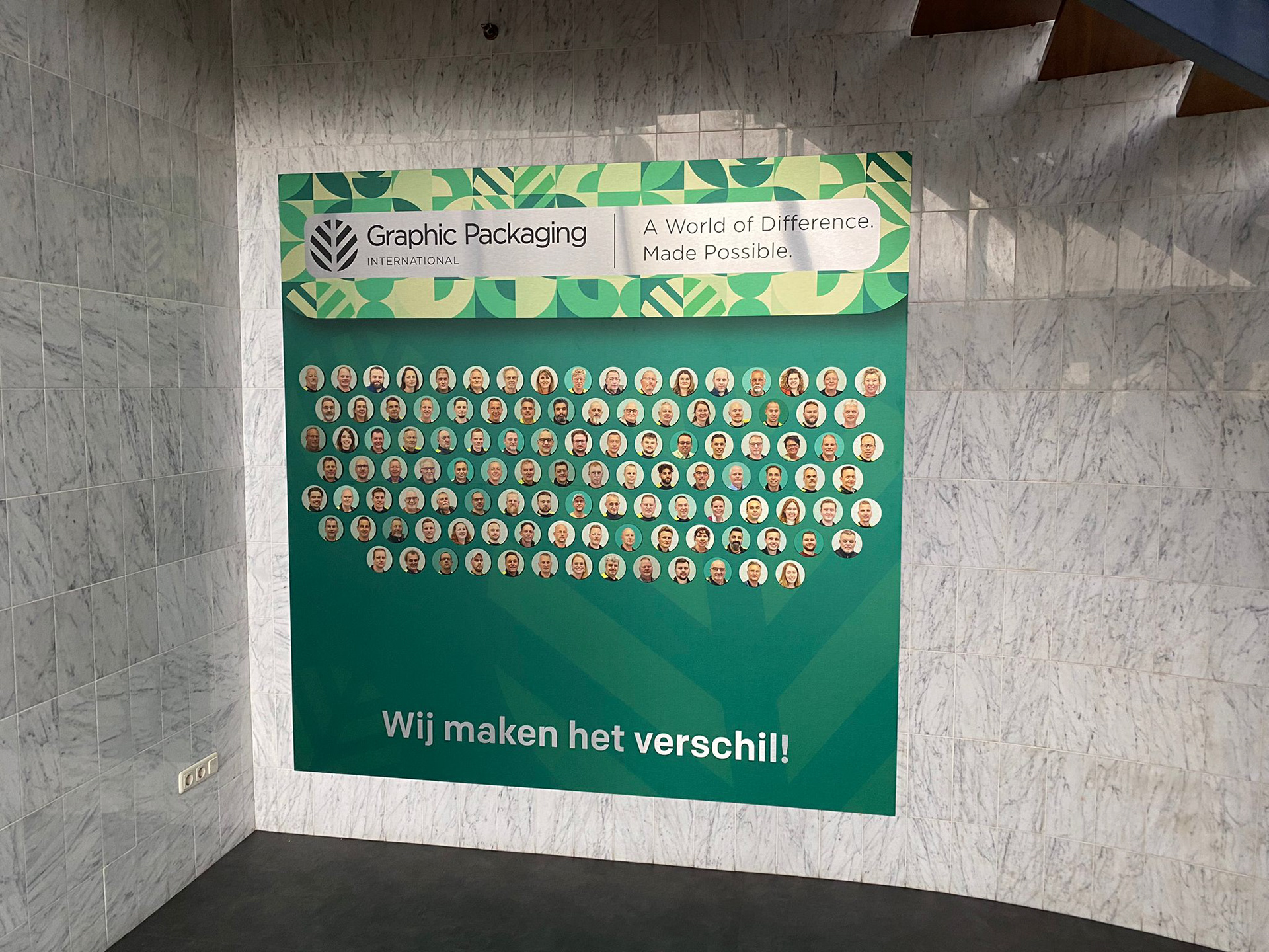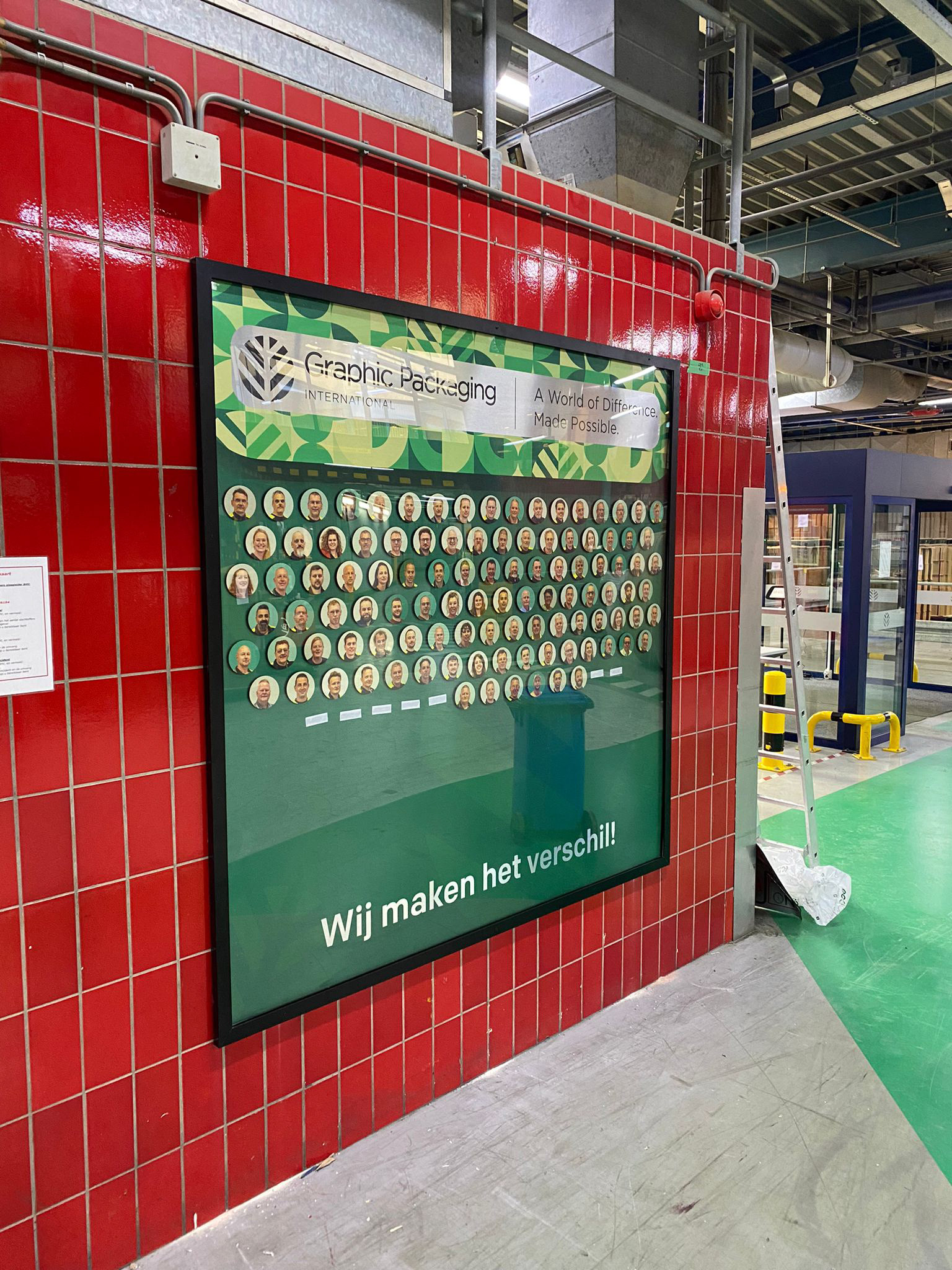 Voor het bedrijf Graphic Packaging heb ik een smoelenboek ontworpen: een groot wandbord waarop alle medewerkers zichtbaar zijn. Er hing eerst niets persoonlijks in de ruimte, en je kon nergens zien wie er allemaal werkten.