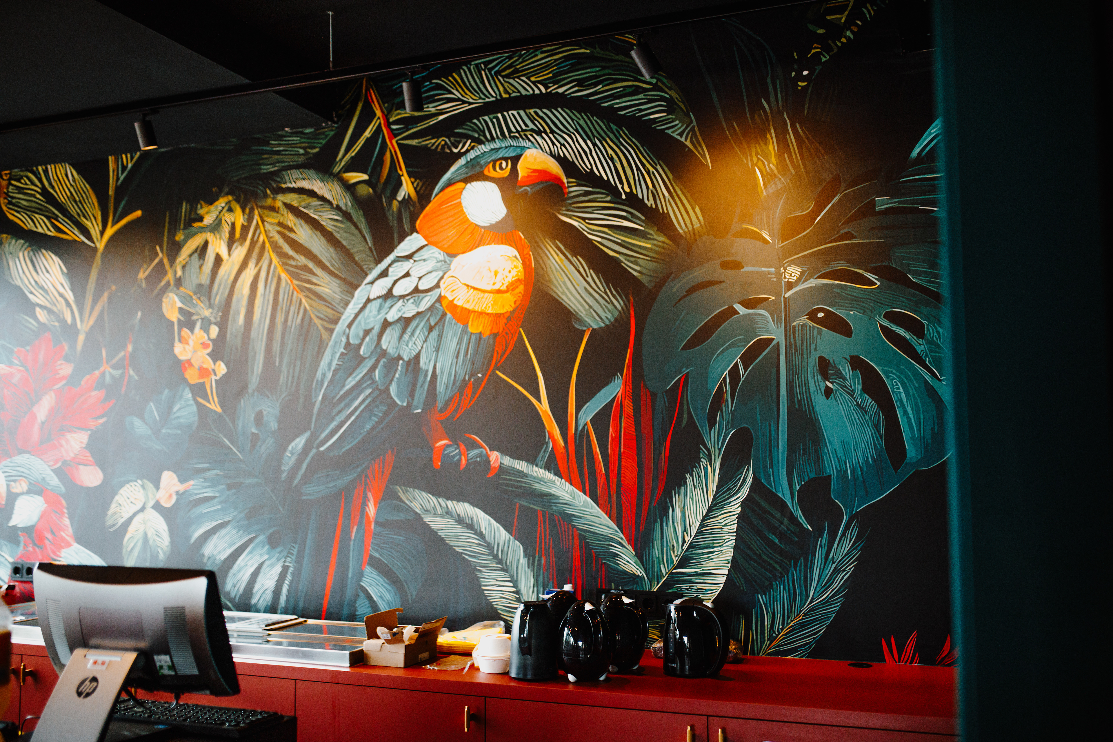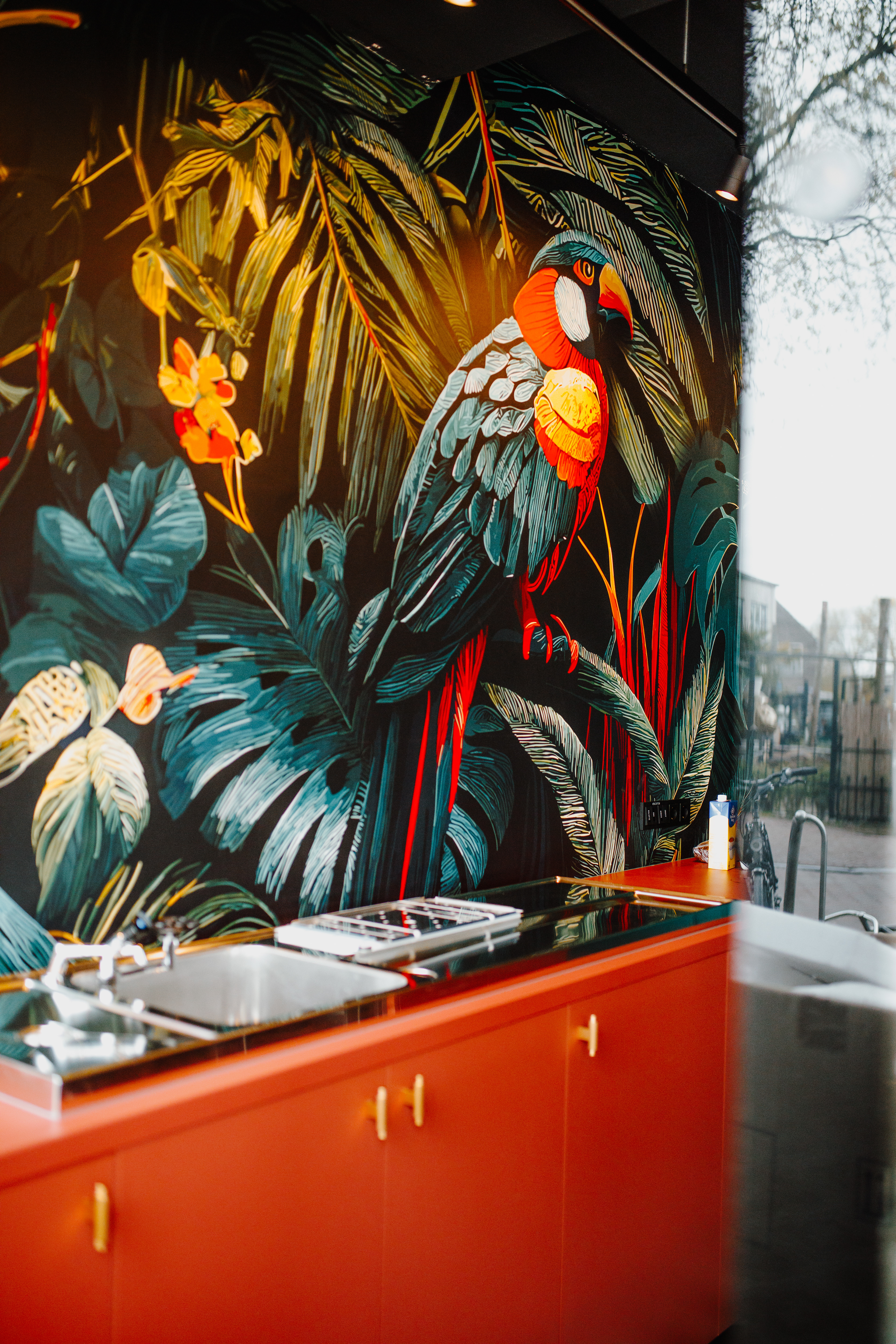 We hebben uiteindelijk gekozen voor een kleurrijke, tropische stijl die warmte en energie uitstraalt. Deze komt terug in de opvallende wandprint met papegaai binnen, en de herkenbare vlag buiten aan de gevel. Alle uitingen zijn op elkaar afgestemd om één duidelijke identiteit neer te zetten.