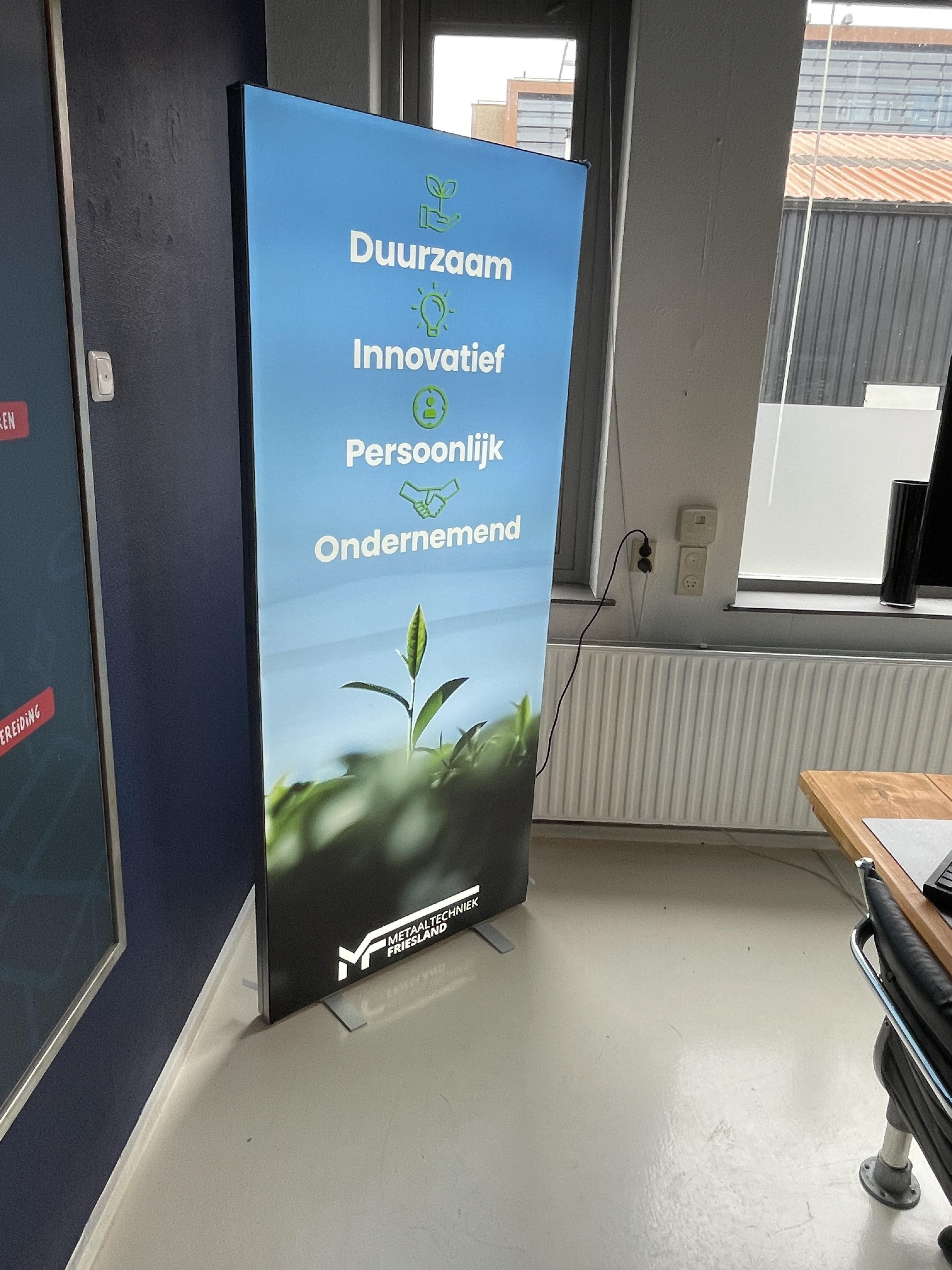 Tijdens mijn stage bij Interlinie kreeg ik de kans om mee te werken aan beursmateriaal voor Metaaltechniek Friesland. Ze wilden een opvallende en heldere uiting die hun kernwaarden communiceerde: Duurzaam, Innovatief, Persoonlijk en Ondernemend.